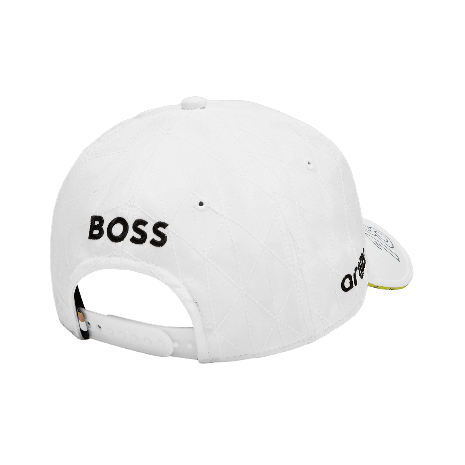 Con un elegante diseño en blanco y detalles en verde y amarillo característicos del equipo, esta gorra luce el número 18 y el logo de Aston Martin Formula One Team bordados con precisión.
