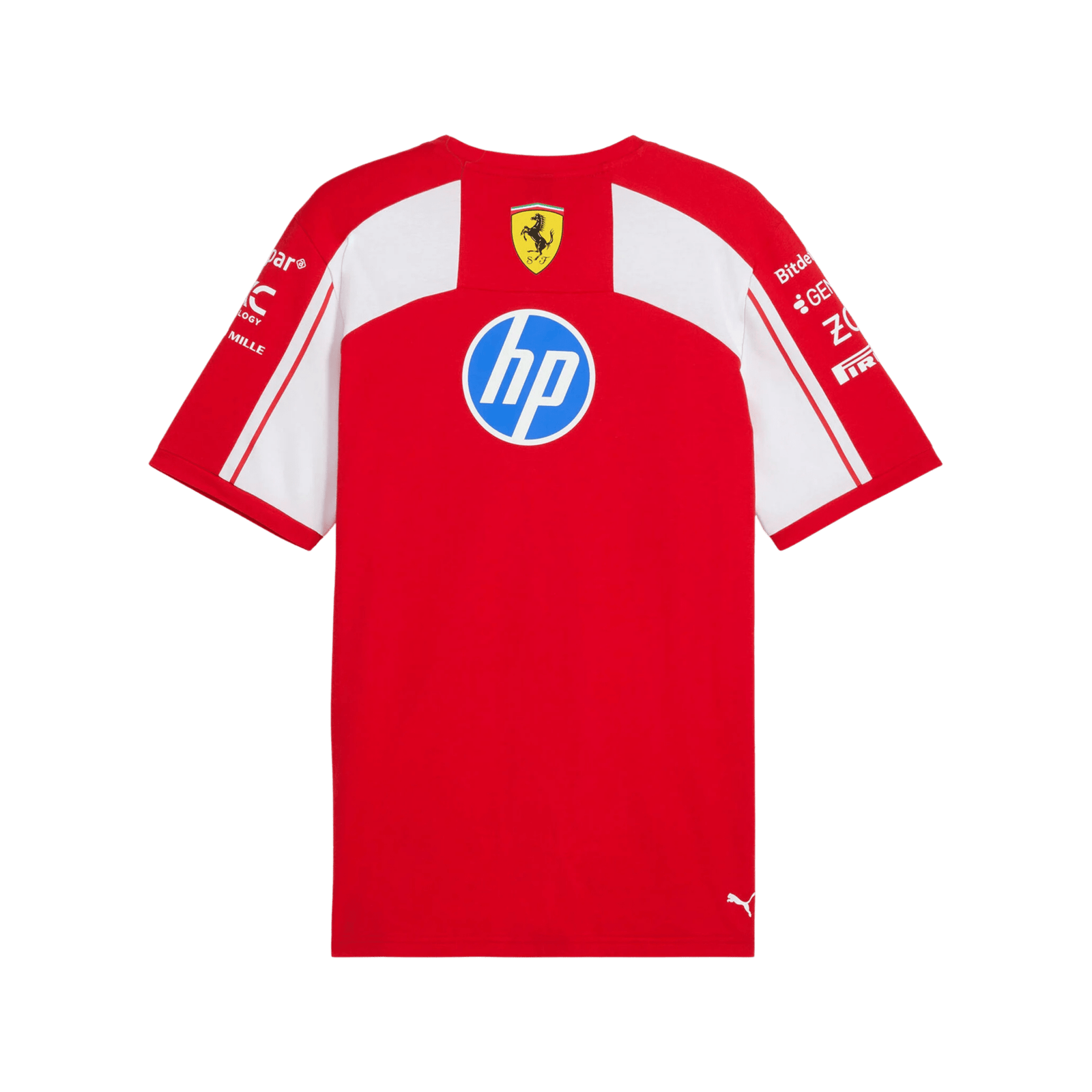 Con su característico rojo Ferrari, esta prenda incorpora los logos oficiales del equipo y patrocinadores principales como HP, Shell, IBM, UniCredit y CEVA Logistics, replicando el diseño que acompaña al equipo durante la temporada. El escudo de Ferrari al frente reafirma su legado histórico dentro del motorsport.