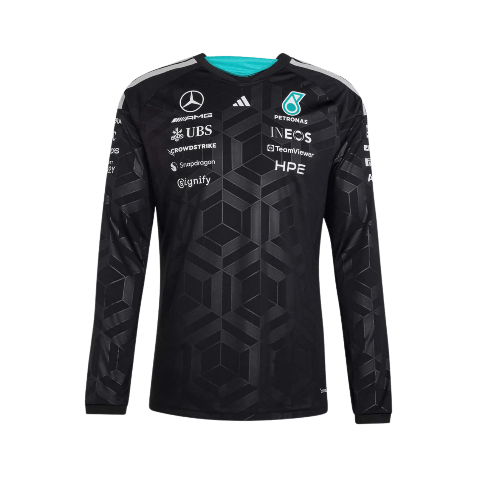 Diseñada para los aficionados que viven la emoción de las carreras, la Playera Mercedes Manga Larga 2026 Negra combina estilo y rendimiento en un elegante diseño.