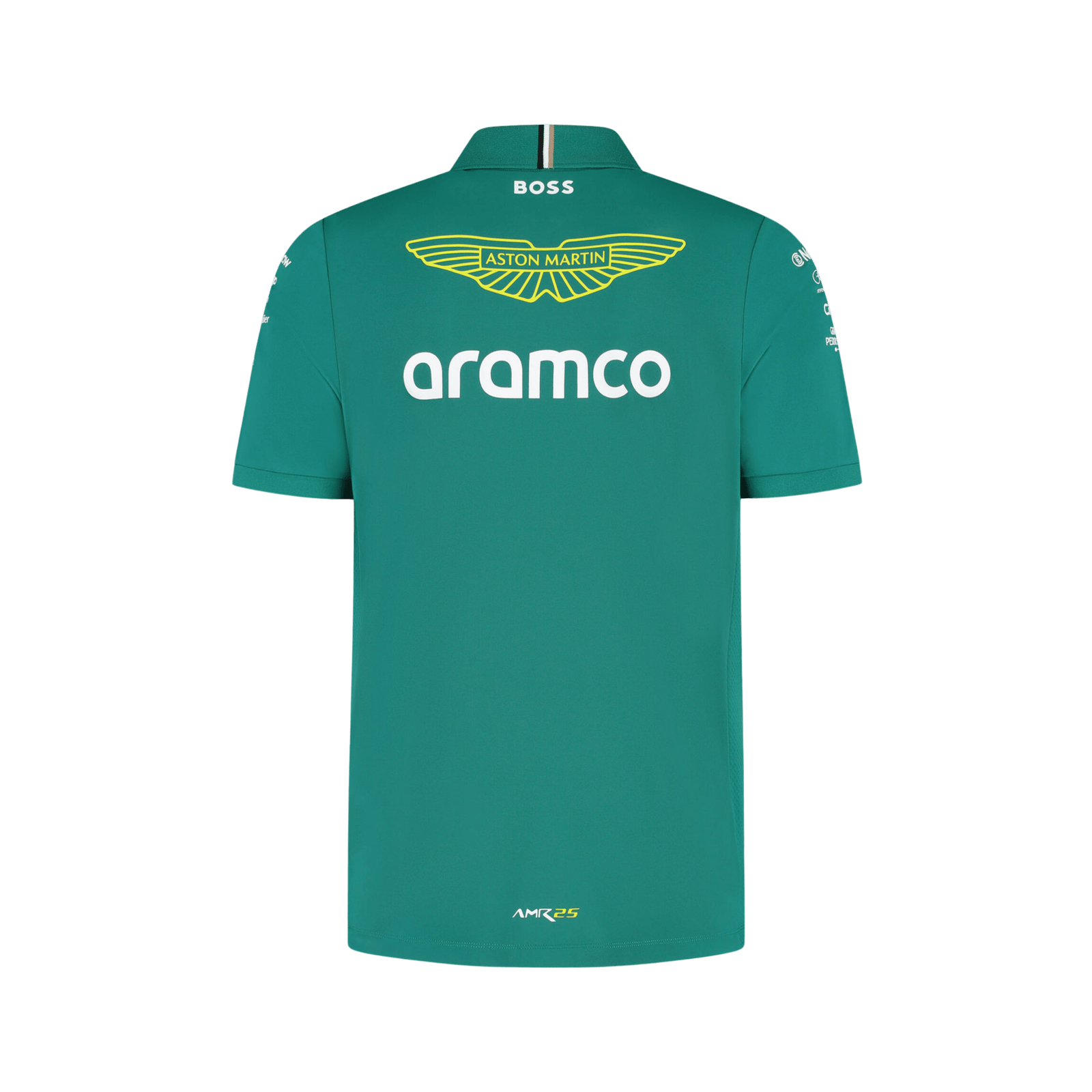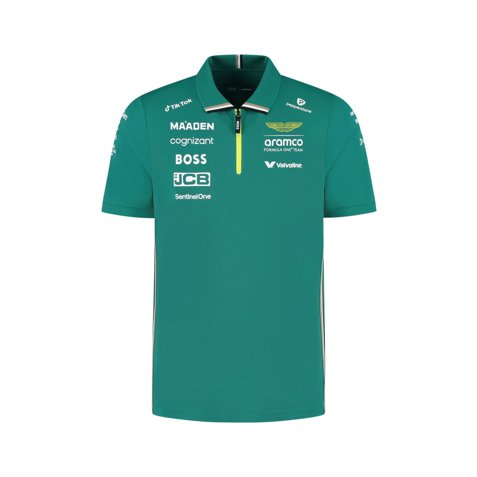 Polo Aston Martin 2025 en el emblemático verde del equipo, con cierre frontal y detalles en contraste que elevan su diseño deportivo. Los logotipos oficiales y acabados limpios reflejan la elegancia característica de Aston Martin, ideal para los fans que buscan representar la Fórmula 1 con un look sofisticado dentro y fuera de la pista.
